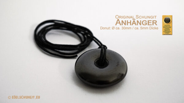 Schungit-Donut-Anhänger werden aus massiven Blöcken der Zazhoginskij-Mine (Karelien) gefertigt. Typ II Schungit (35-74% Kohlenstoff) wird zu runder Donut-Form zuerst grob herausgeschnitten in Scheiben und dann geschliffen und handpoliert.