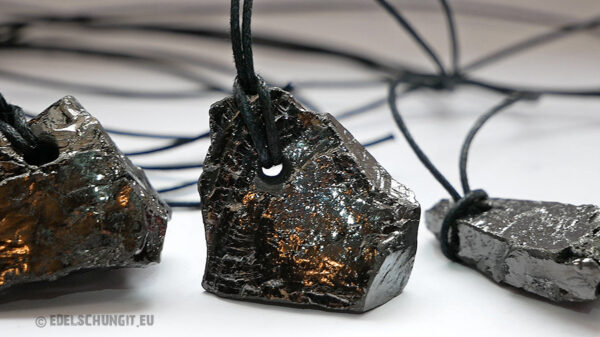 Jeder Anhänger zeigt die natürliche Bruchkante des Edelschungits. Die dunkle, glänzende Oberfläche macht ihn zu einem besonderen Schmuckstück oder Sammlerobjekt.