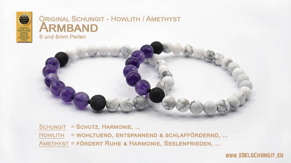 Dieses Armband aus Schungit / Howlith und Amethyst Edelsteine ist ein “Feel good-Armband” und besonders geeignet für Menschen die Ruhe, Harmonie und Ausgeglichenheit brauchen – es ist besonders zu empfehlen für Menschen mit Schlafstörung, denn die Kombination aus Schungit/Howlith/Amethyst ist sehr fördernd für Ruhe, Entspannung und Harmonie – genau das, was für einen erholsamen Schlaf nötig ist. Dieses Armband sollte etwas fester am Handgelenk festsitzen, sodass die Wirkung direkt in die Haut bzw. die Meridiane besser stimuliert werden (das Kautschukband dehnt sich nach 2 bis 3 Wochen etwas – ca. 0,5 bis 1cm).