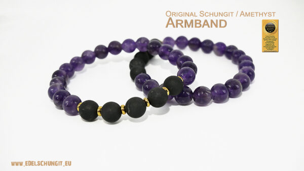 Ein elegantes Edelstein-Armband mit Amethyst, Schungit und Echtgold-beschichteten Zwischenperlen, geeignet für Damen und Herren.
